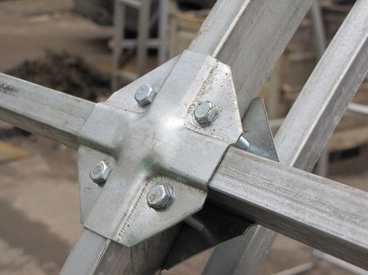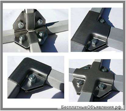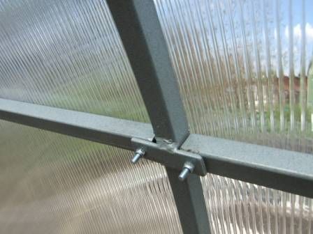 Каркас теплицы скрепляют с помощью специальных деталей «Х», «Г» или «Т»-образной формы и стягивают оцинкованными болтами. Крабы «Х»-образной формы крепятся на 4 болта, что придаёт каркасу теплицы монолитность, прочность и точную геометрию сборки, т.к. таким соединением можно состыковать от 1 до 4 профилей, но только под прямым углом. Поэтому отсутствие перекосов при сборке теплицы гарантировано.
